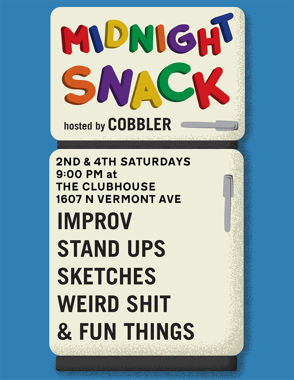 I designed the logo and a template poster for the local comedy show, Midnight Snack. The show is a late night Smörgåsbord of improv, standup, sketch comedy, and more.